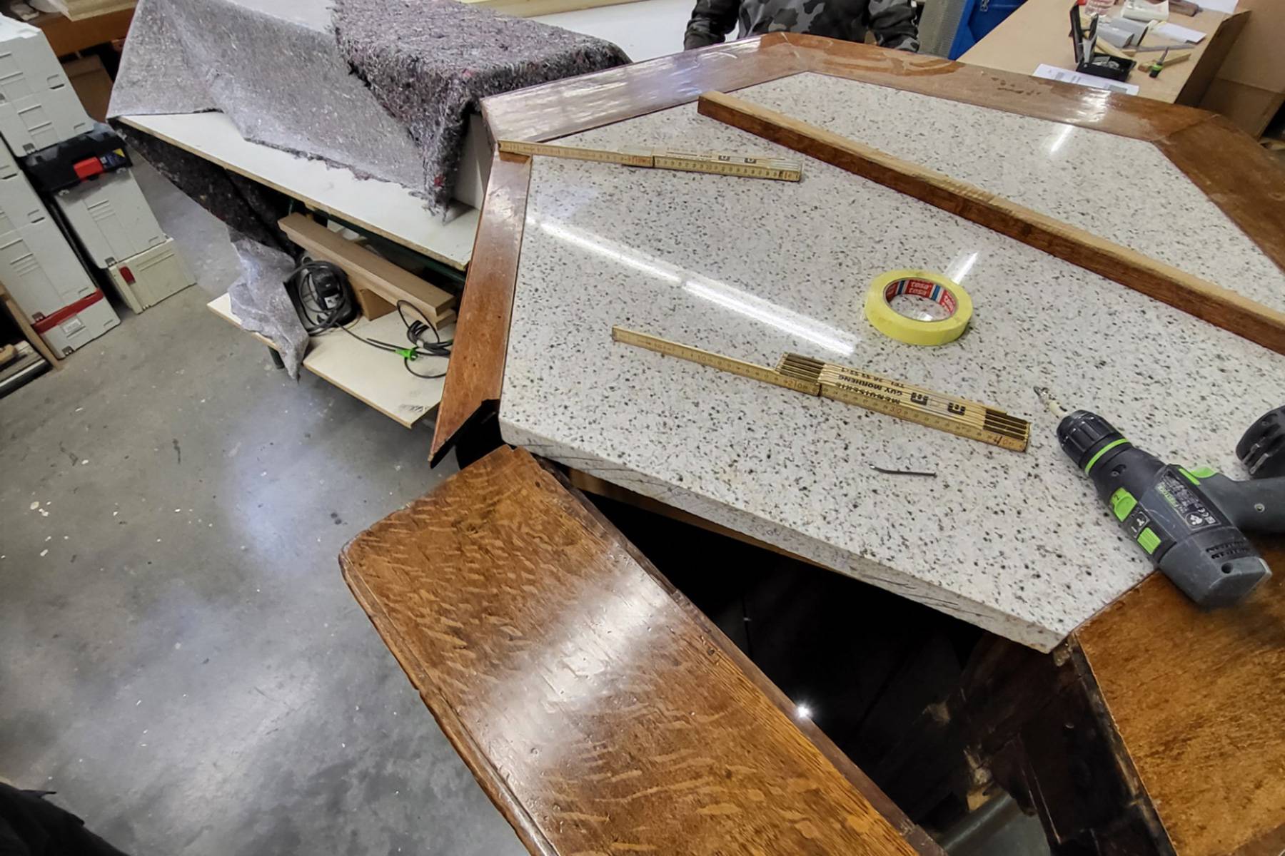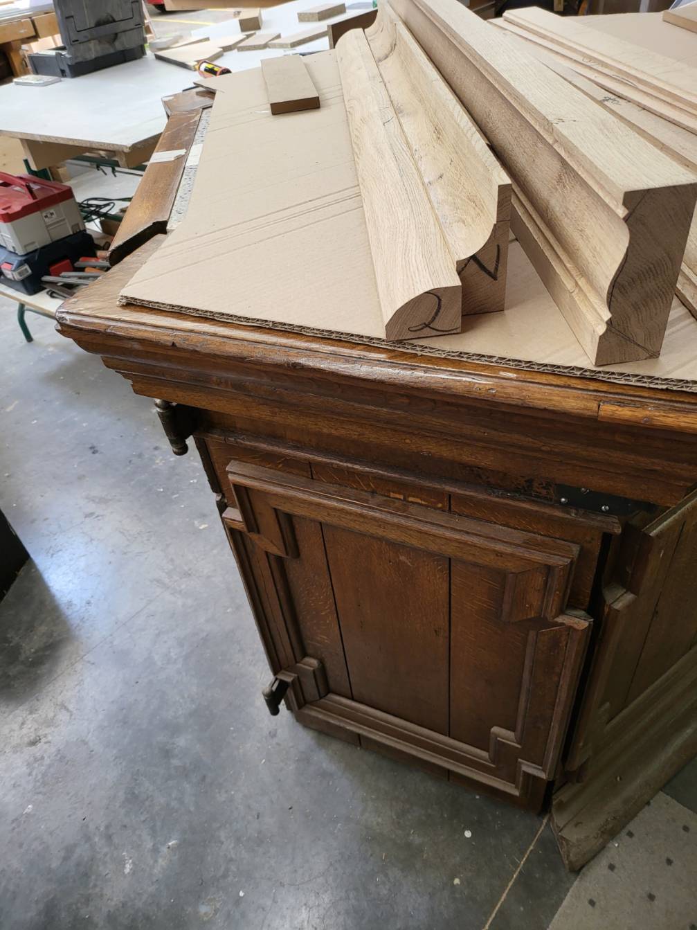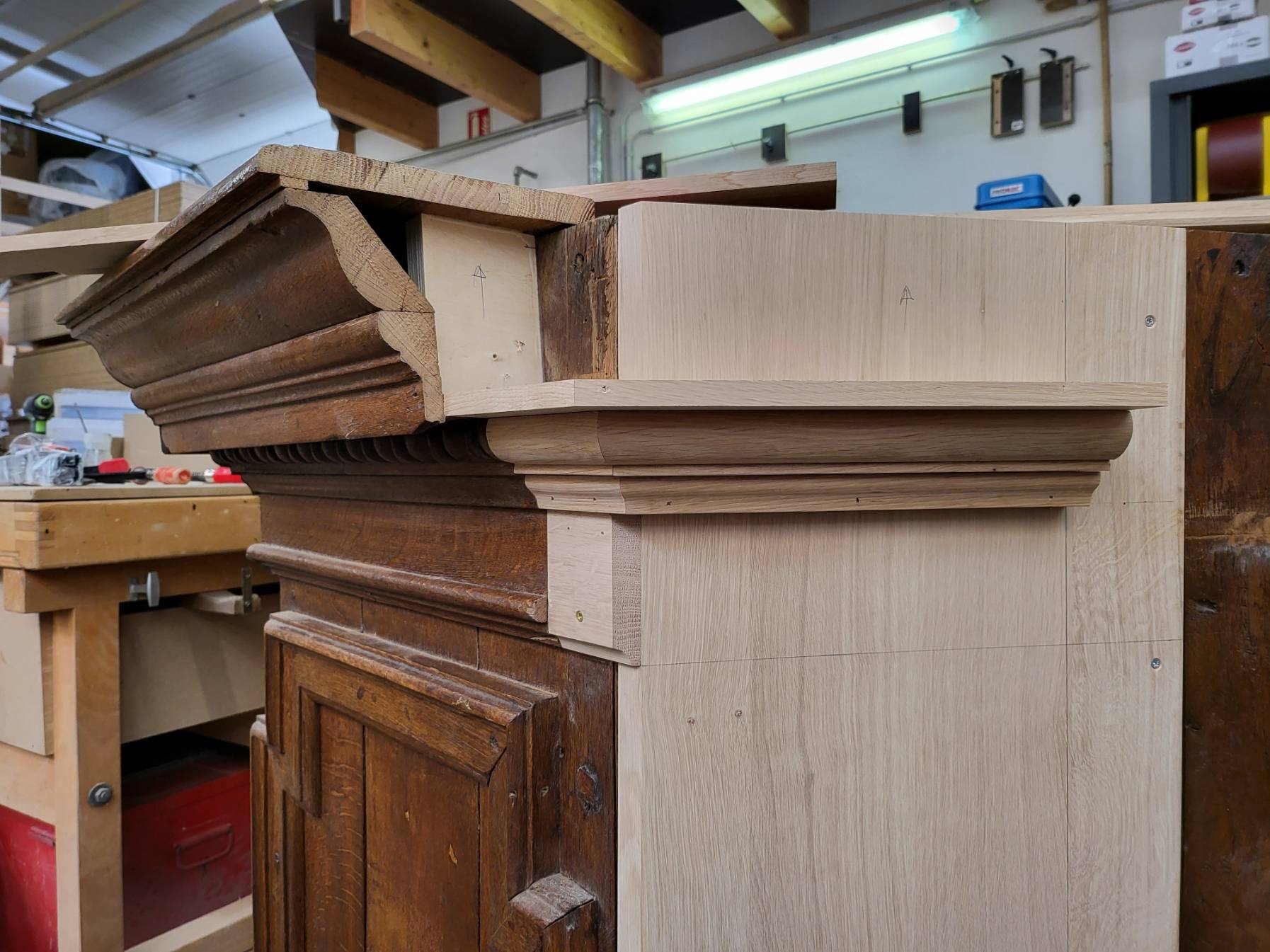 Parfois, nous avons aussi des projets inhabituels, comme cette chaire. Ici, l'âge a provoqué de petits dommages qui ont dû être réparés. Nous nous sommes efforcés de rester aussi fidèles que possible au design original de la chaise.