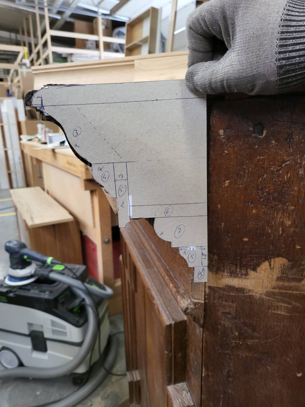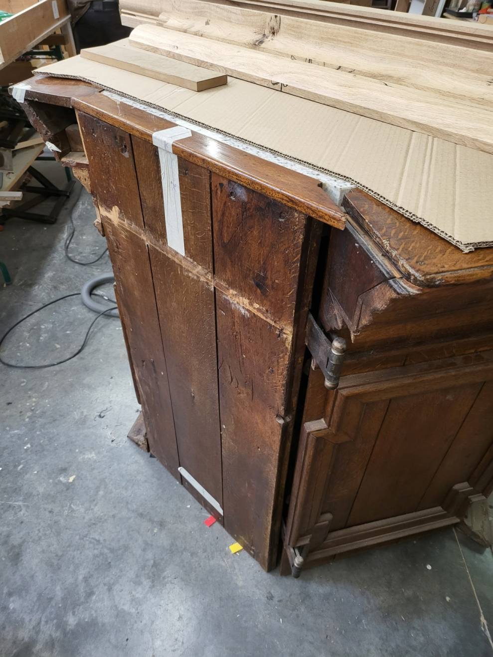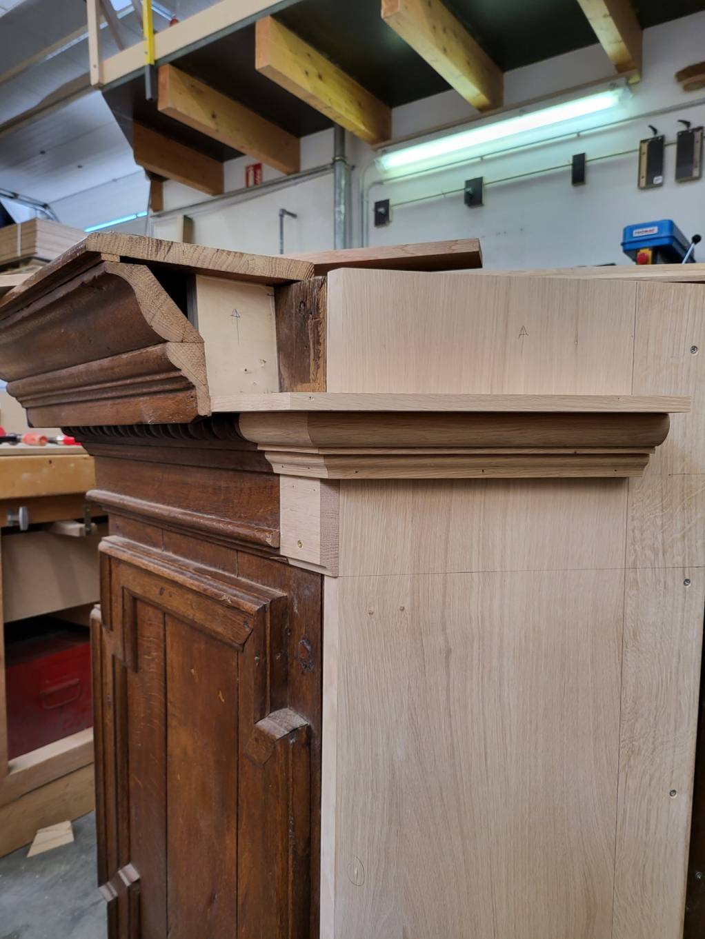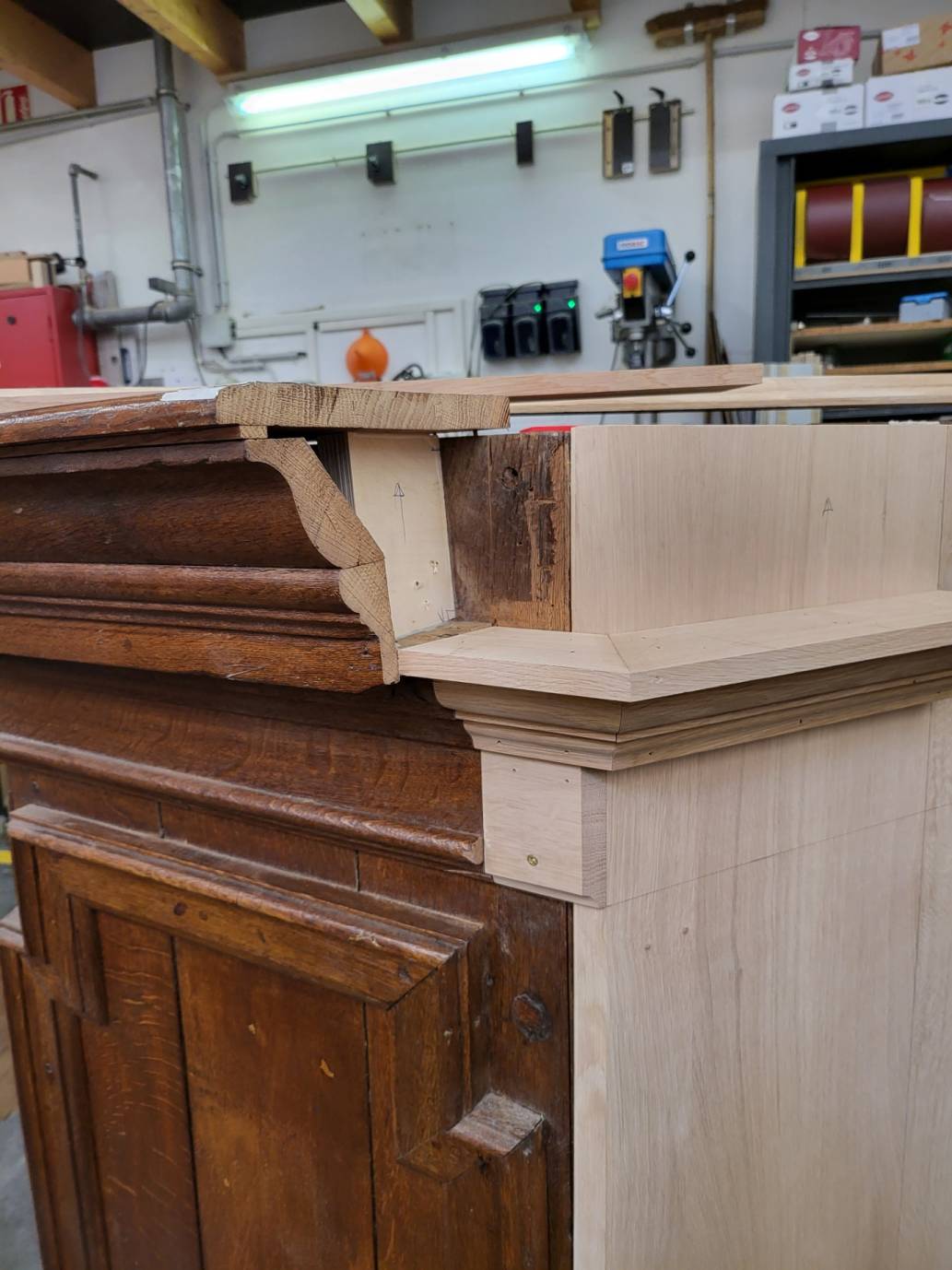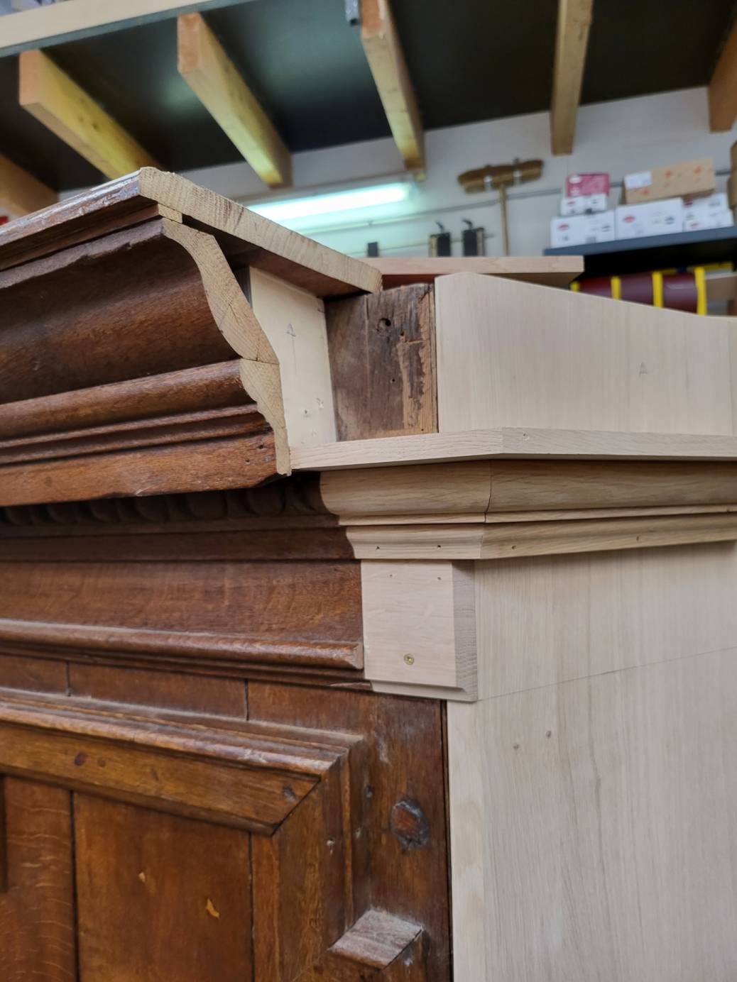 Parfois, nous avons aussi des projets inhabituels, comme cette chaire. Ici, l'âge a provoqué de petits dommages qui ont dû être réparés. Nous nous sommes efforcés de rester aussi fidèles que possible au design original de la chaise.